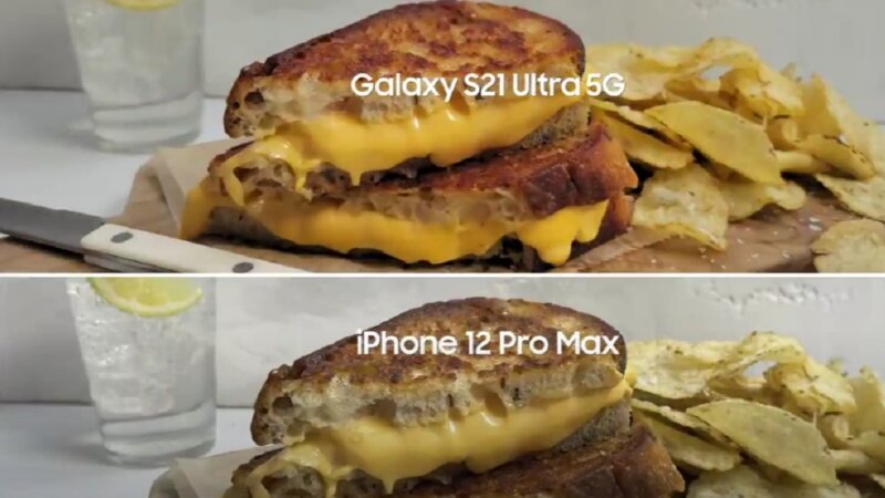 Во втором видео те же смартфоны снимают сэндвич с сыром. Оба использовали зум, чтобы показать объект в деталях, но изображение на iPhone выходит заметно более размытым. «Обновитесь до эпического зума», — предложили создатели видео.