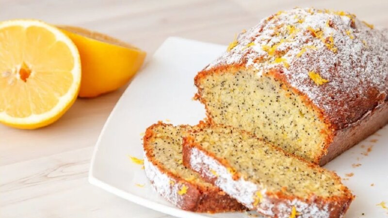 Для приготовления глазури смешивать сахарную пудру и лимонный сок, пока не получится густая смесь. Выложить на остывший кекс, посыпать маком и цедрой лимона.