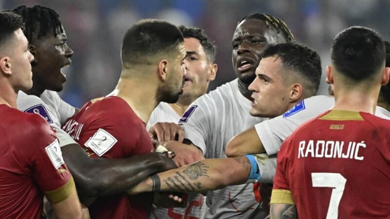 Футболисты сборных Швейцарии и Сербии устроили потасовку в конце игры на ЧМ в Катаре. Инцидент произошел в добавленное время.