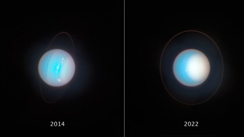 По словам ученых, в этот период в северных широтах возникают множественные штормы с облаками из кристаллов метанового льда. На последнем снимке, сделанном Hubble в ноябре 2022 года, видно, что северный полюс теперь больше наклонен к Солнцу.