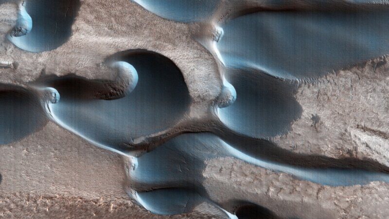 Ученые уточнили, что более четкое изображение было получено с высоты 317,7 км. На снимке видны песчаные насыпи, образующиеся под воздействием марсианского ветра.