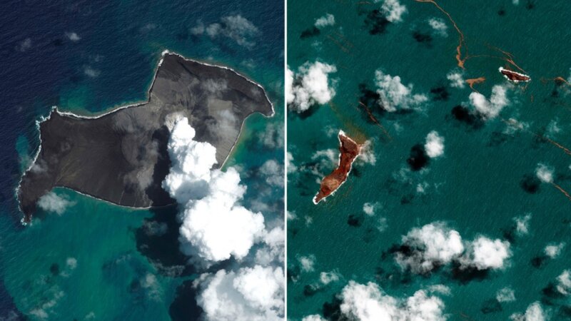 Спутниковые снимки, опубликованные американской компанией космических технологий Maxar Technologies, показали разрушительные последствия извержения вулкана Хунга-Тонга-Хунга-Хаапай на архипелаге Тонга. Извержение произошло на прошлой неделе, 14 января, и ощущалось во многих регионах Тихого океана.