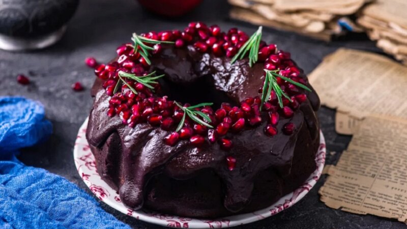 - Для глазури разломать 100 грамм шоколада, залить его 100 мл сливок и 2 ст. л. сгущенки, нагреть в течение одной минуты, перемешать и полить кекс. Когда глазурь застынет, посыпать десерт зернами граната.