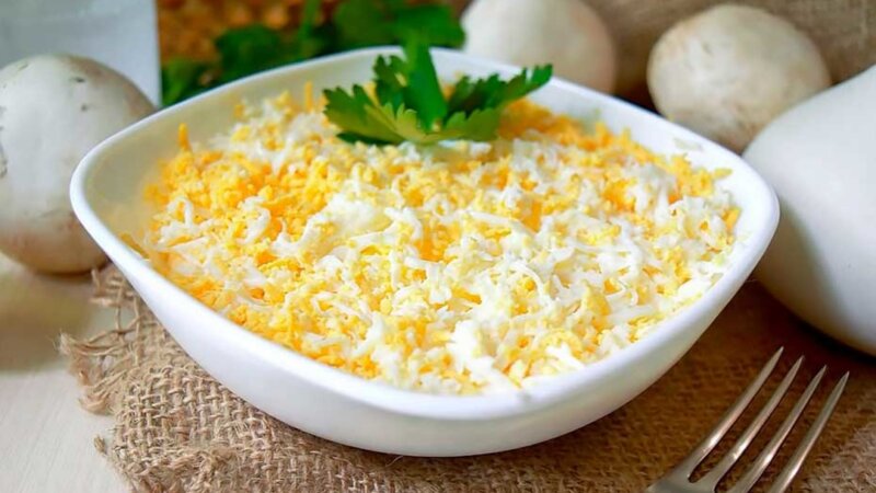 Таким салатом просто насытиться, так как он в своем составе содержит достаточно большое количество белка. Блюдо можно подавать к столу с рубленой свежей зеленью. Он прекрасно подойдет как к рядовому застолью, так и к празднику.
