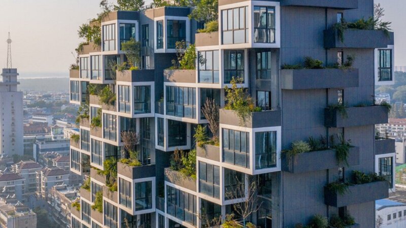 В китайском городе Хуанган построили первый комплекс многоэтажных зданий с вертикальным лесом. Ожидается, что такие дома будут насыщать воздух кислородом и поглощать из атмосферы вредные выбросы.