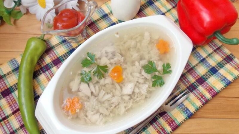 - Добавьте измельченный чеснок и залейте бульоном. Украсьте заливное по вкусу и поставьте в холодильник до полного застывания. Заливное готово, приятного аппетита!