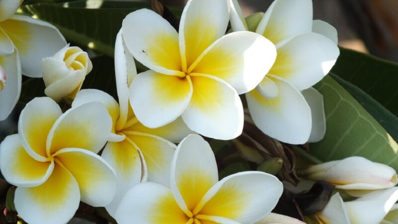 Плюмерия. Имеет тропический аромат и входит в состав некоторых духов. Цветок не переносит холода, поэтому его лучше поставить на южное окно. Растение необходимо много поливать, но в тоже время следить, чтобы не было избытка влаги. Цветет плюмерия розовыми, желтыми и белыми соцветиями.