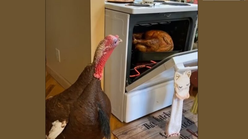 Птица по кличке Биг Ред заглядывает в приоткрытую духовку, в которой жарится такая же индейка. «Что ты делаешь, приятель? Все в порядке, ты его не знаешь», — говорит автор видео.