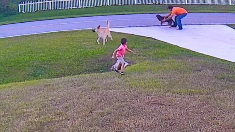 На кадрах, опубликованных в сети, видно, как черная собака мчится к мальчику и почти добирается до него, но дорогу ему преграждает Танк. Пес яростно отбивает атаку собаки, защищая своего маленького друга, пока тот пытается убежать.