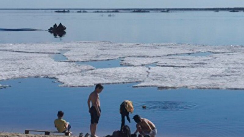 Жители Салехарда Ямало-Ненецкого АО вышли на берег Оби, чтобы принять солнечные ванны. Все бы ничего, но на реке еще продолжается ледоход, начавшийся неделю назад.