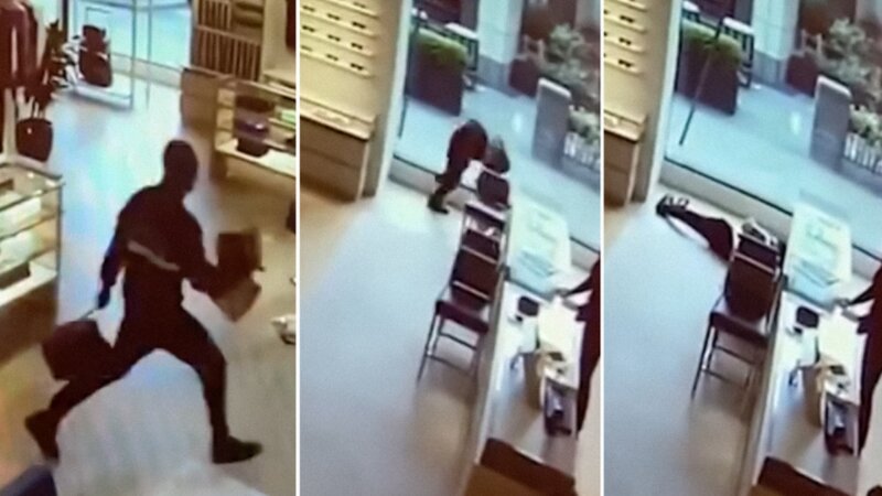 На кадрах, сделанных камерой видеонаблюдения, видно, как грабитель с несколькими сумками в руках бежит в поисках выхода и бросается в стеклянную дверь, после чего остается лежать на земле. В этот момент его задерживает охранник.