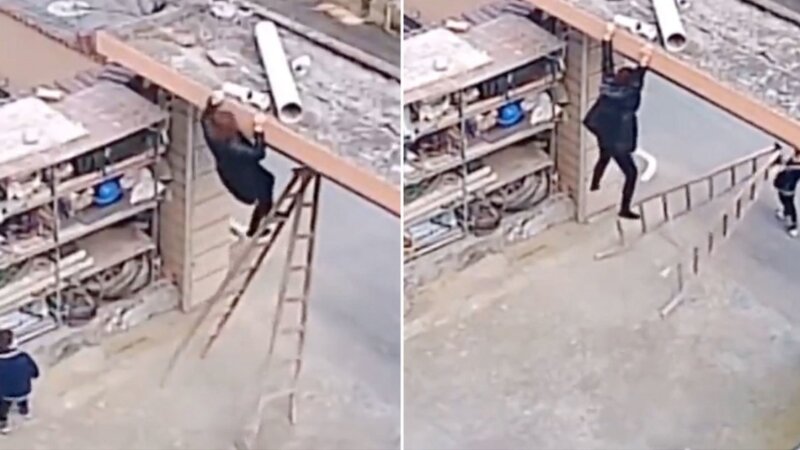 В Индии мальчик спас маму, когда у нее из-под ног упала лестница, по которой она поднималась на крышу. Женщина осталась висеть, зацепившись руками за карниз.