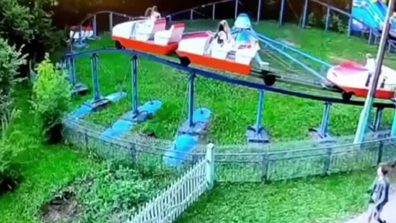 На ролике видно, как дети катаются на аттракционе, похожим на американские горки. В какой-то момент одна из кабинок слетает с рельсов и падает, перевернувшись. Видео заканчивается тем, что на помощь к пострадавшим бегут очевидцы.