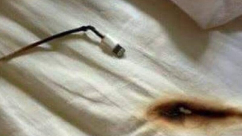 Пожарные опубликовали фото, которые показывают, насколько опасно может быть зарядное устройство на легковоспламеняющейся поверхности. На снимках видно, как зарядка прожгла кровать.